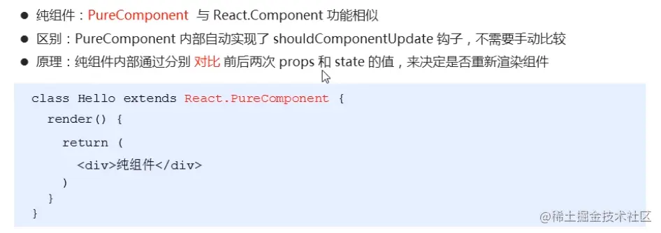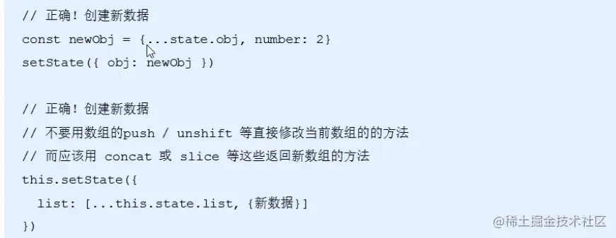 注意:纯组件方式 内部的对比是shallow compare(浅层对比),state中对于数值型数据来说,直接赋值,没有坑。但是对于引用类型来说,只比较对象的引用地址是否相同。如果只是修改了对象中的某个属性,但是对比发现内存地址没有变。所以,state或者props中属性值为引用类型时,应该创建新数据,不要直接修改原始数据。