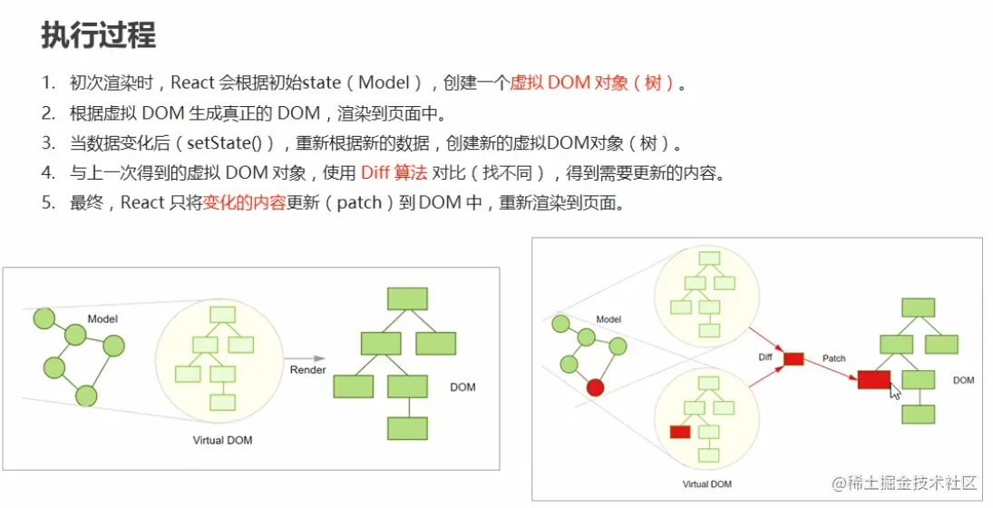 组件的render()调用后,根据状态和JSX结构生成虚拟DOM对象。render方法并不意味着浏览器的重新渲染,仅仅说明要进行diff算法。