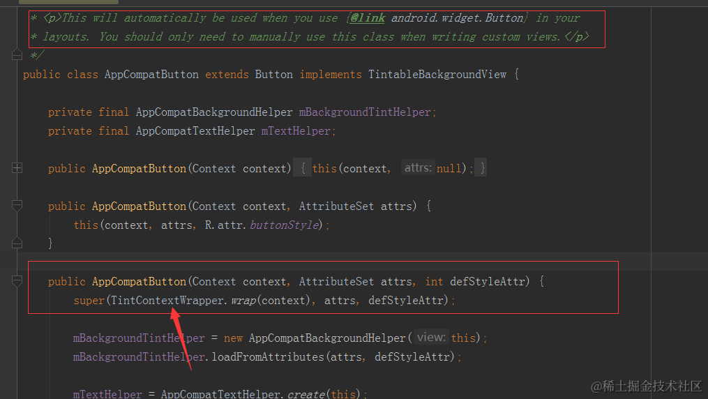 我们的activity继承自AppCompatActivity时,也就是引用的是v7包时,我们的button就自动转为AppCompatButton 了(具体的可以参见AppCompatButton 源码注释)。同时在AppCompatButton 中我们的Context就变成了图中第二个框中的TintContextWrapper了。
