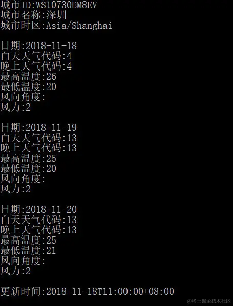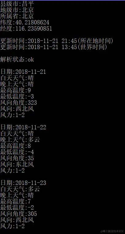 char heweather_str[] = "{\"HeWeather6\":[{\"basic\":{\"cid\":\"CN101010700\",\"location\":\"昌平\",\"parent_city\":\"北京\",\"admin_area\":\"北京\",\"cnty\":\"中国\",\"lat\":\"40.21808624\",\"lon\":\"116.23590851\",\"tz\":\"+8.00\"},\"update\":{\"loc\":\"2018-11-21 21:45\",\"utc\":\"2018-11-21 13:45\"},\"status\":\"ok\",\"daily_forecast\":[{\"cond_code_d\":\"100\",\"cond_code_n\":\"100\",\"cond_txt_d\":\"晴\",\"cond_txt_n\":\"晴\",\"date\":\"2018-11-21\",\"hum\":\"21\",\"mr\":\"16:02\",\"ms\":\"04:27\",\"pcpn\":\"0.0\",\"pop\":\"0\",\"pres\":\"1030\",\"sr\":\"07:08\",\"ss\":\"16:53\",\"tmp_max\":\"9\",\"tmp_min\":\"-3\",\"uv_index\":\"5\",\"vis\":\"10\",\"wind_deg\":\"323\",\"wind_dir\":\"西北风\",\"wind_sc\":\"1-2\",\"wind_spd\":\"4\"},{\"cond_code_d\":\"100\",\"cond_code_n\":\"101\",\"cond_txt_d\":\"晴\",\"cond_txt_n\":\"多云\",\"date\":\"2018-11-22\",\"hum\":\"21\",\"mr\":\"16:36\",\"ms\":\"05:33\",\"pcpn\":\"0.0\",\"pop\":\"0\",\"pres\":\"1030\",\"sr\":\"07:09\",\"ss\":\"16:52\",\"tmp_max\":\"8\",\"tmp_min\":\"-4\",\"uv_index\":\"3\",\"vis\":\"20\",\"wind_deg\":\"35\",\"wind_dir\":\"东北风\",\"wind_sc\":\"1-2\",\"wind_spd\":\"5\"},{\"cond_code_d\":\"101\",\"cond_code_n\":\"100\",\"cond_txt_d\":\"多云\",\"cond_txt_n\":\"晴\",\"date\":\"2018-11-23\",\"hum\":\"23\",\"mr\":\"17:15\",\"ms\":\"06:41\",\"pcpn\":\"0.0\",\"pop\":\"16\",\"pres\":\"1024\",\"sr\":\"07:10\",\"ss\":\"16:52\",\"tmp_max\":\"7\",\"tmp_min\":\"-2\",\"uv_index\":\"2\",\"vis\":\"20\",\"wind_deg\":\"305\",\"wind_dir\":\"西北风\",\"wind_sc\":\"1-2\",\"wind_spd\":\"3\"}]}]}";