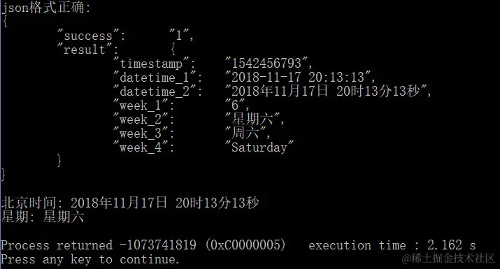 char bj_time_str[] = "{\"success\":\"1\",\"result\":{\"timestamp\":\"1542456793\",\"datetime_1\":\"2018-11-17 20:13:13\",\"datetime_2\":\"2018年11月17日 20时13分13秒\",\"week_1\":\"6\",\"week_2\":\"星期六\",\"week_3\":\"周六\",\"week_4\":\"Saturday\"}}";