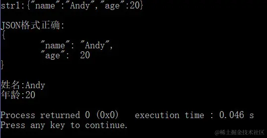 这个JSON对象只有两个键值对,键name对应字符串Andy,键age对应数字20。