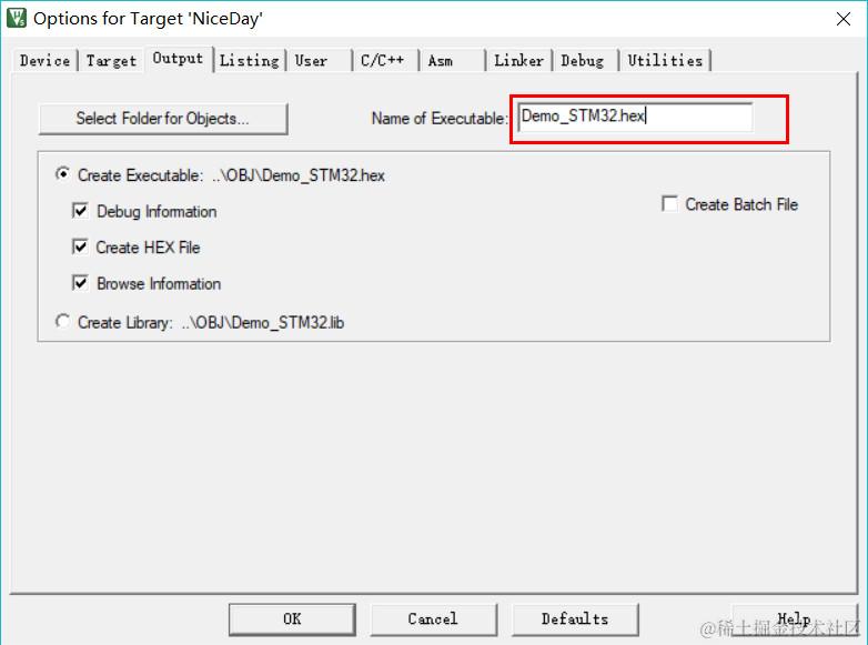 5.把Output界面的NiceDay改为Demo_STM32.hex