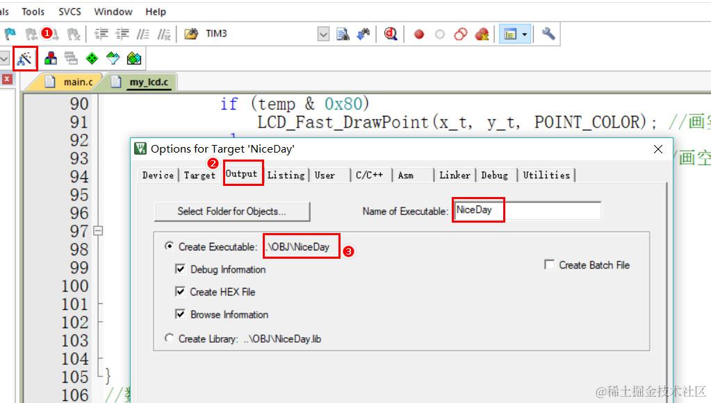 打开工程配置界面中的,Output选项,可以看出我这个工程输出文件存放的路径是在OBJ目录下,名称是NiceDay