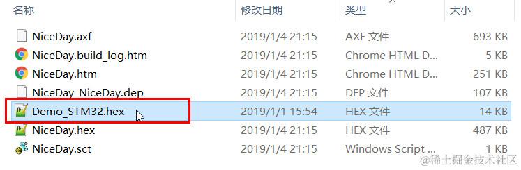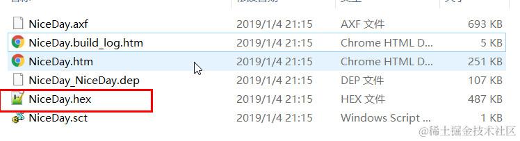 打开OBJ目录可以看到这个工程生成的hex文件名称为NiceDay.hex