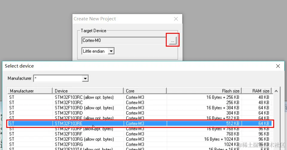 这里支持很多ARM Cortex内核的芯片,选择对应的芯片,我这里选择的是STM32F103RE系列。