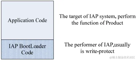 IAP(In-application-programming),即在应用中编程。当产品发布之后,可以通过网络方便的升级固件程序,而不需要拆机下载程序。IAP系统的固件一般由两部分组成,即BootLoader Code和Application Code,并存储在不同起始地址的空间里: