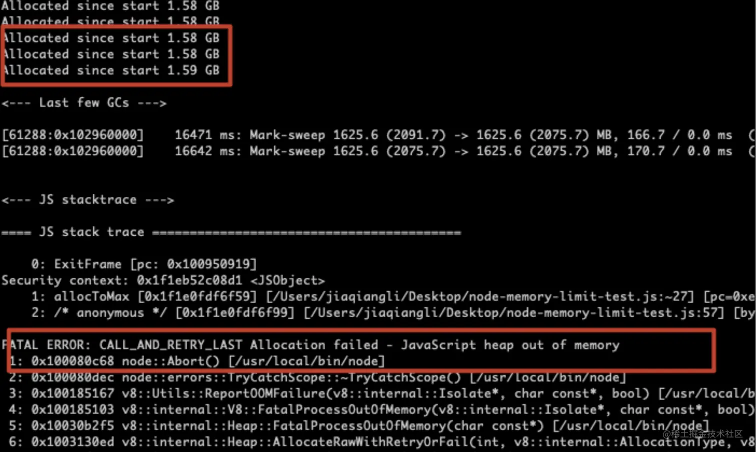 我的电脑是 Macbook Pro masOS Catalina 16GB,Node 版本是 v12.16.1,这段代码大概在 1.6 GB 左右内存时候抛出异常。