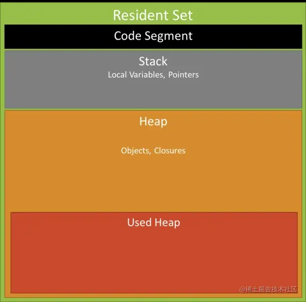 - 常驻集大小:是RAM中保存的进程所占用的内存部分,其中包括: