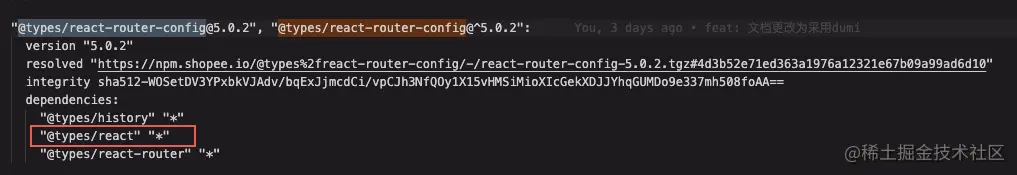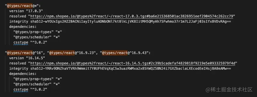 经过一通细致的检查,在 yarn.lock 中发现组件库依赖的 react 版本是 16,而 dumi 依赖的 react 版本是*,*的版本下载了 17 版本的 react,由于两个版本的 react 的 ts 类型不同,导致了类型检查不通过。