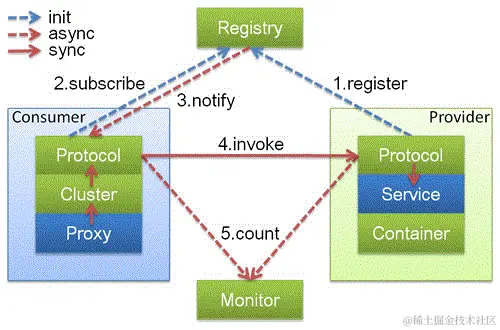 下面从Dubbo官网直接拿来,看一下基于RPC层,服务提供方和服务消费方之间的调用关系,如图所示: