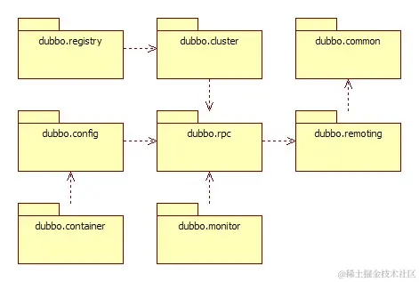 Dubbo以包结构来组织各个模块,各个模块及其关系,如图所示: