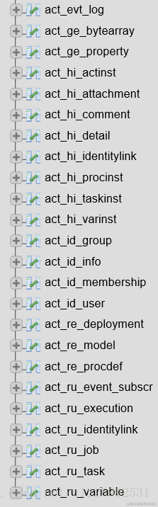 运行这个类之后数据库里面会生成24张表,因为我之前有看一些文章说是23张表,23-25张表都是有可能的,我这里是生成了24张表,多了一张act_evt_log,事件处理日志表。最主要的还是那23张表吧。