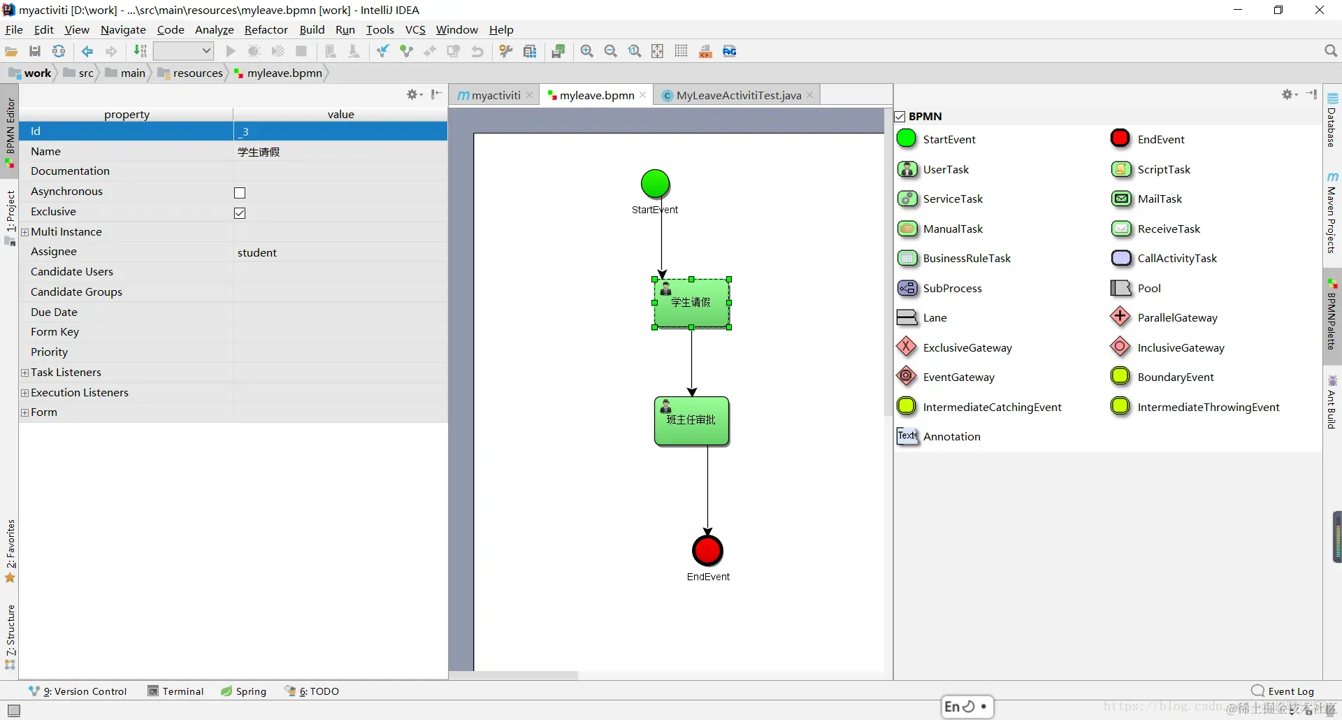 3、画完流程图之后要更改对应元素的name和assignee,我这里画的一个很简单的流程图,只用到了startEvent、endEvent和userTask。我的流程是做的学生请假的审批。如图: