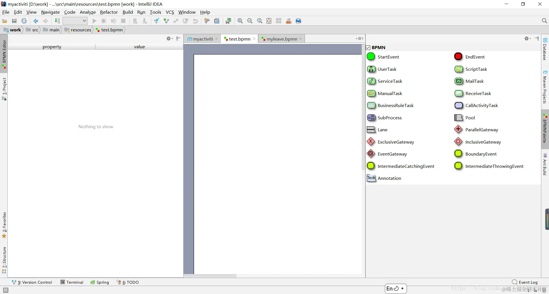 新建之后页面会变成如下图所示这样,中间是画布,右边是一些元素,左边是每个元素的一些详细信息,直接拖拽右边的元素就可以画流程了。