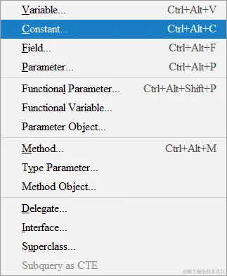 对应的还有变量的抽取、常量的抽取等,看下图,这是鼠标右击 》Refactor 》Extract 操作后出现的效果,里面包含很多的抽取: