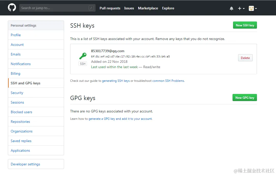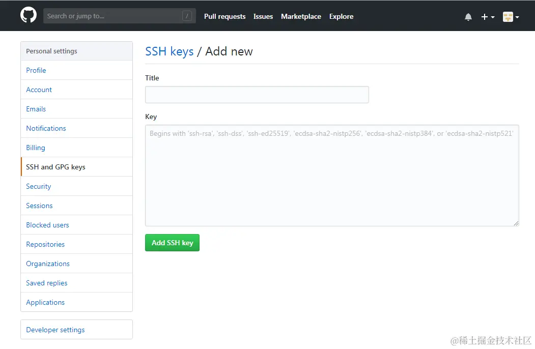 点击右上角的“New SSH key”按钮,跳到以下界面
