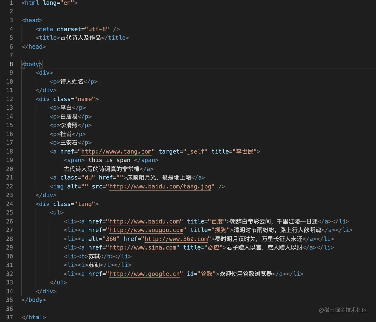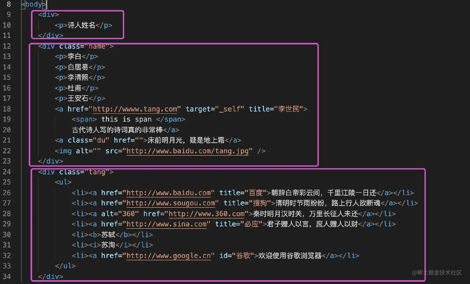 假设我们现在本地有一个HTML文件待解析,具体内容如下,数据中有各种HTML标签:html、head、body、div、p、a、ul、li等