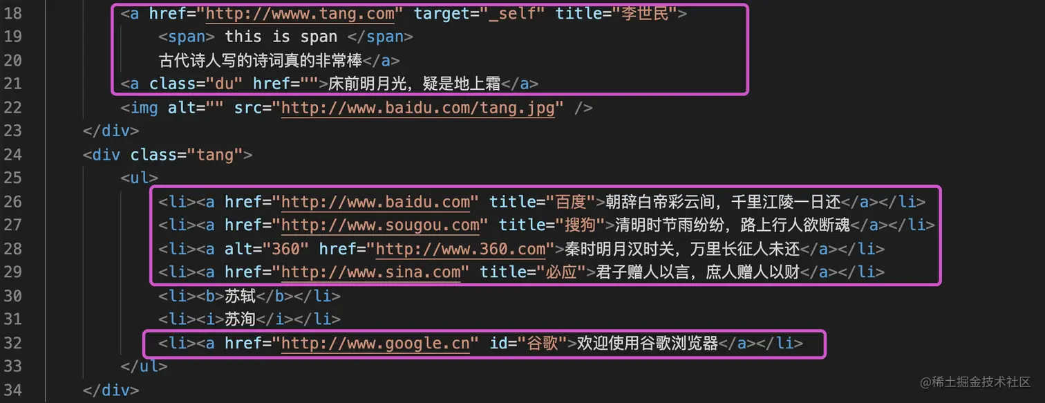 两个信息全部指定a标签中,我们只需要获取到a标签,通过两个属性href和target即可锁定:
