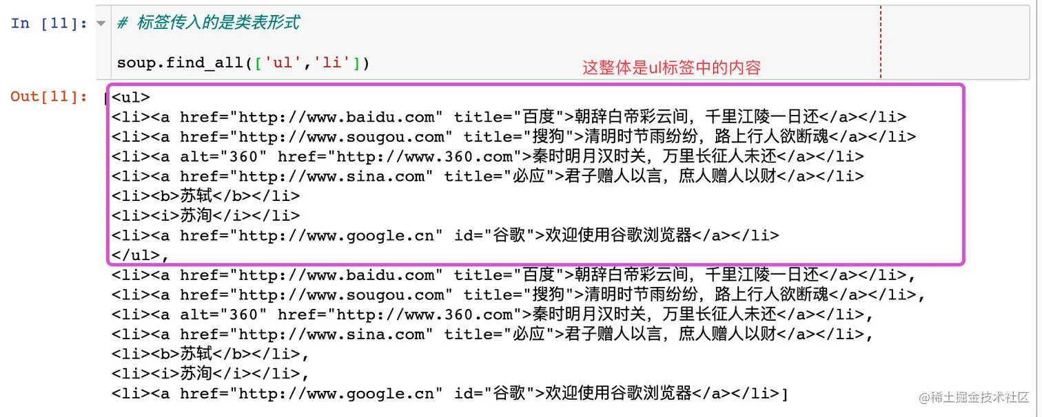 该方法返回的是指定标签下面的所有内容,而且是列表的形式;传入的方式是多种多样的。