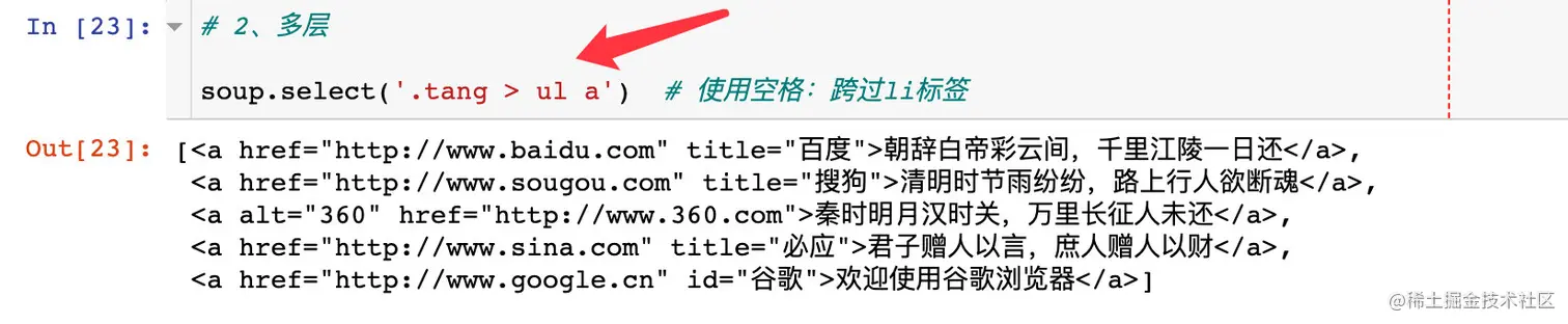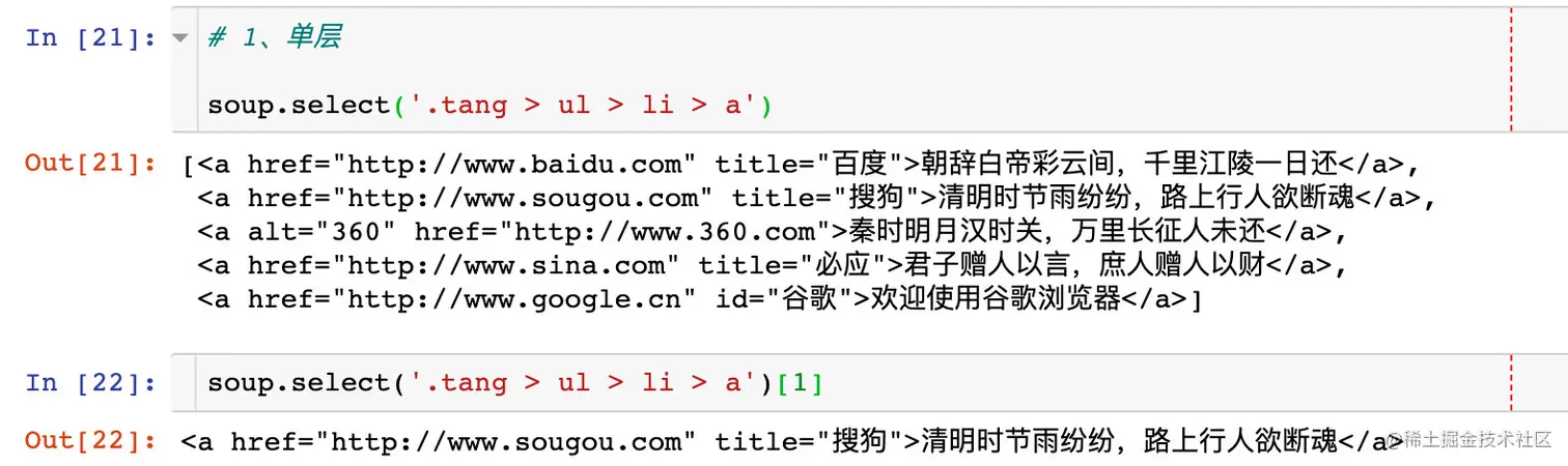 在soup.select()方法中是可以使用层级选择器的,选择器可以是类、id、标签等,使用规则:
