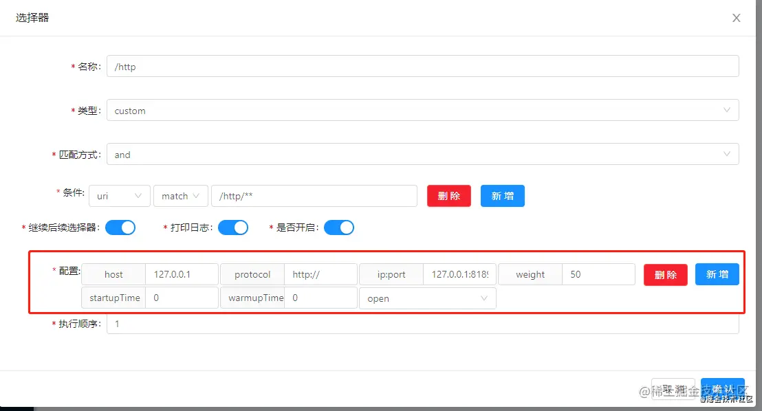 但仍有几个点需要着重解释一下: - 1.插件数据、选择器数据、规则数据的获取全部来自于BaseDataCache,该类是数据同步过程中最终会影响的类。 - 2.选择器的类型,在使用SpringMvc项目进行接口注册时,会有一个isFull的选项为true代表全局代理,在全局代理模式下只会注册一个选择器\规则(指代代理所有的接口),所以这里的对应处理为rule.size()-1. - 3.选择器和规则的选择,实际的处理要复杂的多,考虑到是介绍一次请求流程的大体逻辑,所以这里不展开阐述,有兴趣的可以查看MatchStrategy、AbstractMatchStrategy及其相关实现类(后期会单独开一篇具体讲解),此处对应页面的如下: