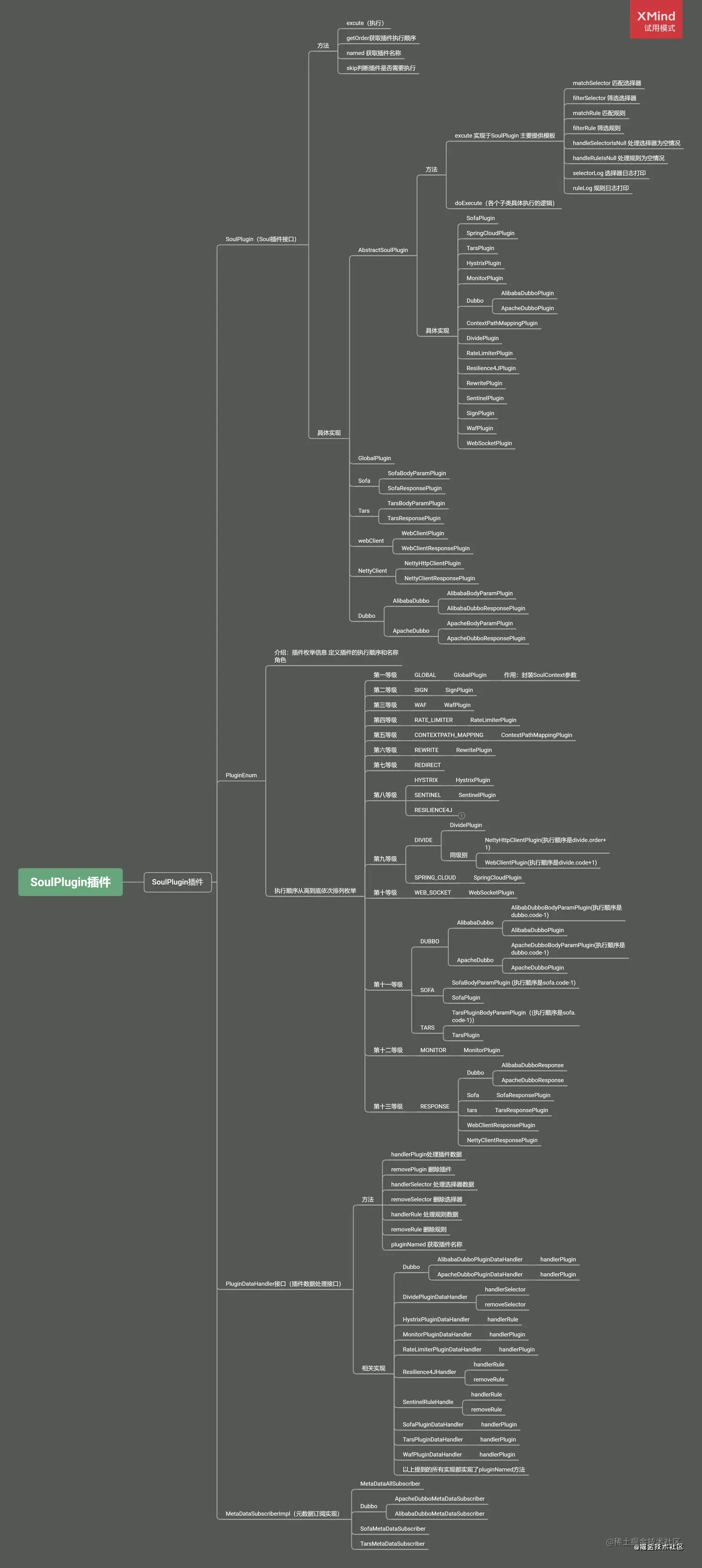 我们大体梳理了注入到plugins的插件,但是即使这样依然不能纵观全局,对此特地对soul插件所涉及的类进行了相关梳理,整体梳理结果如下图。