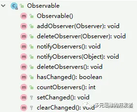 包含:注册观察者(addObserver)、移除观察者(deleteObserver)、通知观察者(notifyObserver)等方法。