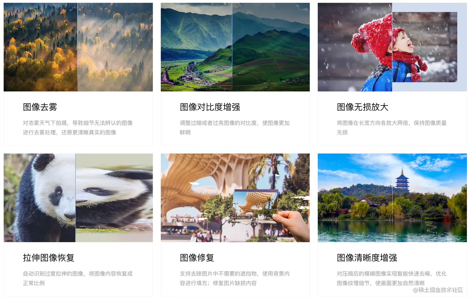 图像增强平台提供了 8 大能力,分别是图像去雾、图像对比度增强、图像无损放大、拉伸图像恢复、图像修复、图像清晰度增强、图像色彩增强、人像动漫画。每一个功能的视觉效果都极为震撼!
