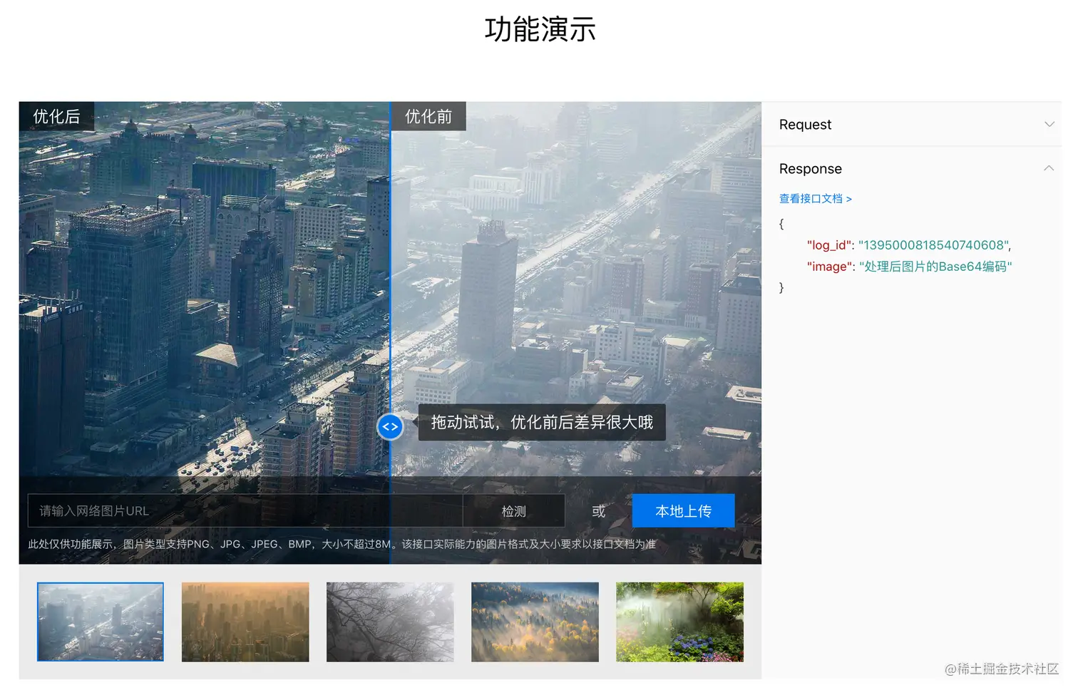 最棒的是,我们可以本地上传、或者输入网络图片 URL 来使用图像增强,在优化后的图片点击右键就能直接保存了,因此我们可以将该平台作为一个强大的在线工具使用。还能在右侧查看接口的请求与返回值,帮助开发者调试。