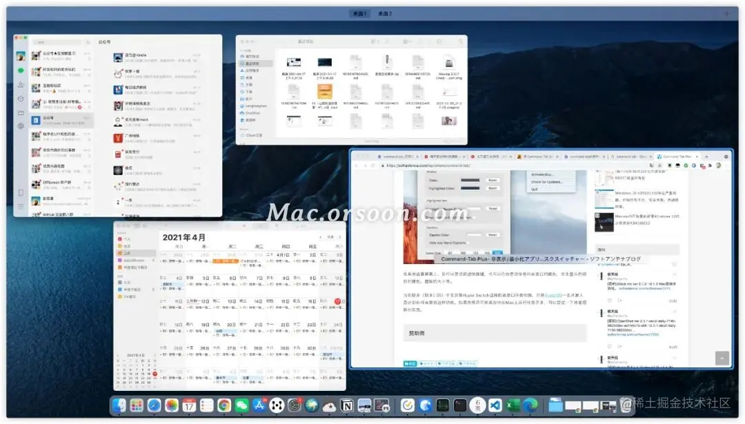 一种是像在 Windows 系统上的操作,按下 Command + Tab 键,桌面中央会出现切换应用的窗口。