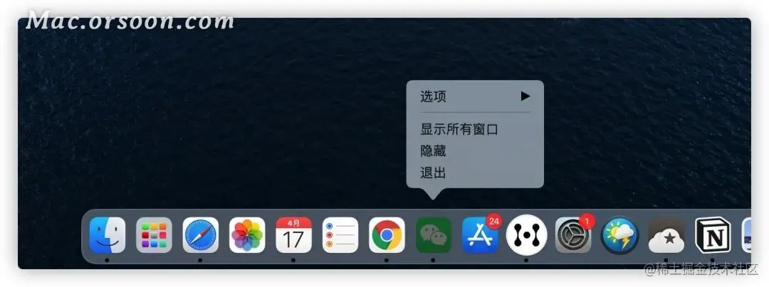 另一种方法是,右击 Dock 栏的软件图标,选择「退出」。