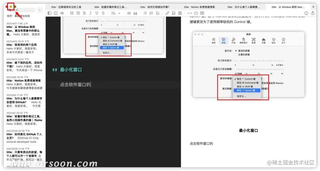 Manico 与系统中使用 Command + Tab 呼出软件切换窗口是分离开的,它默认使用 Option 键激活切换窗口,按下 Option 键到呼出软件切换窗口,中间有一小会的时间间隔。
