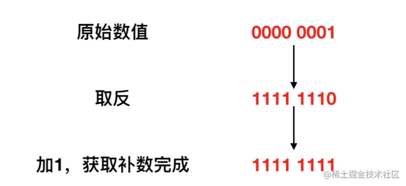 如果用8位表示一个有符号整数,最高位为符号位,1 的表示为0000 0001。那 -1 该如何表示呢?答案是:1111 1111。如果你首次看到这个表示法可能很奇怪,为什么不是1000 0001呢,其实它是基于加法运算推演出来的结果。我们用让计算机计算1 - 1,即1 + (-1),即0000 0001 + 1111 1111 结果为 1 0000 0000,舍去溢出的高位 1,结果就是 0 。所以 -1 对应到二进制就成了1111 1111。从正数到负数的表示,产生了补数的概念,它的计算是这样的: