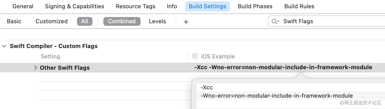 该选项进对 OC 模块代码有作用,对于 Swift 的引用还需要加另外一个编译参数:-Xcc -Wno-error=non-modular-include-in-framework-module。添加位置为:
