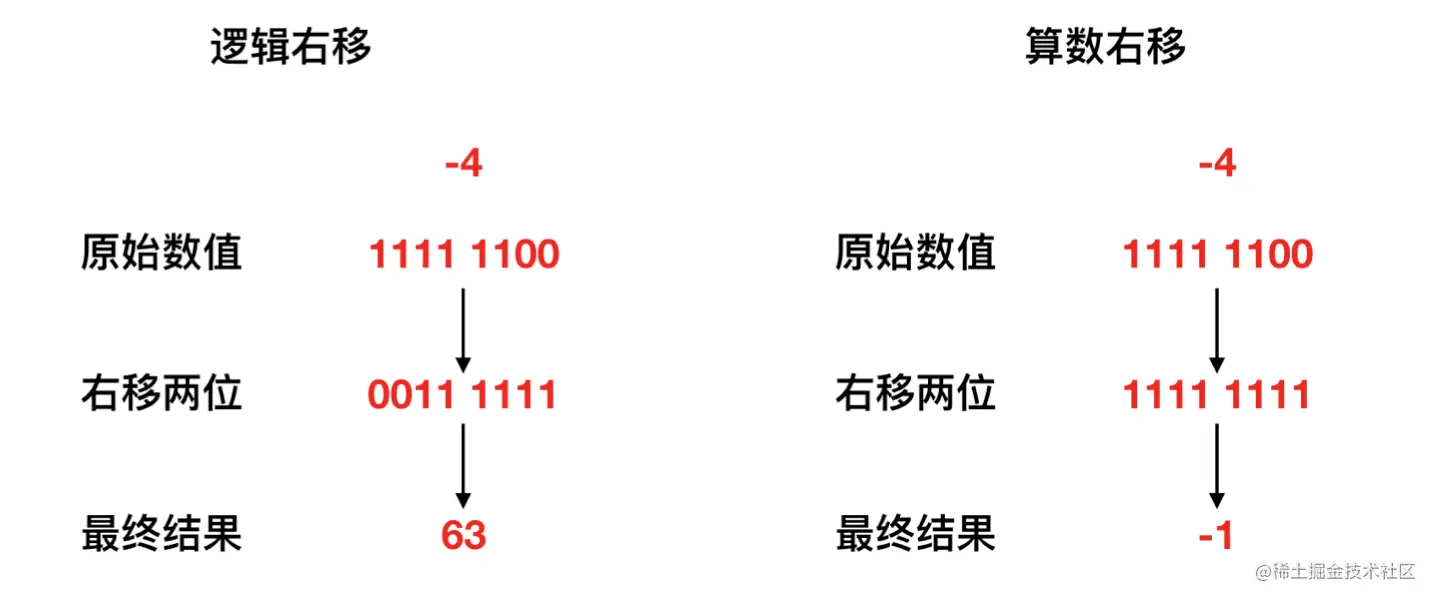 代码中通常使用的 >>、<<符号都是算数移位,因为右移一位会让数值缩小为原来的一半,所以某些二分查找的写法会使用该技巧。