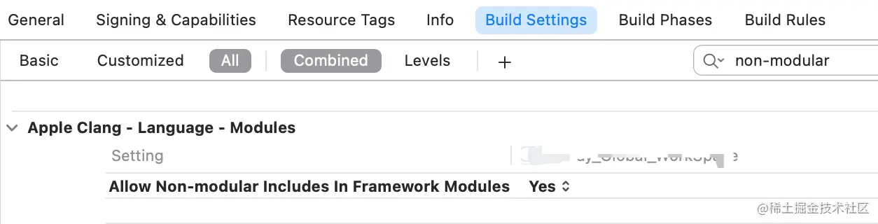 Build Settings 里搜索 non-modular,将以下Allow Non-modular Includes In Framework Modules选项设置为 Yes。