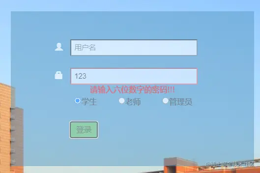 在这里,验证的数据为密码是否是六位纯数字,如果是,则提交数据并跳转页面;如果不是则给出如下提示: