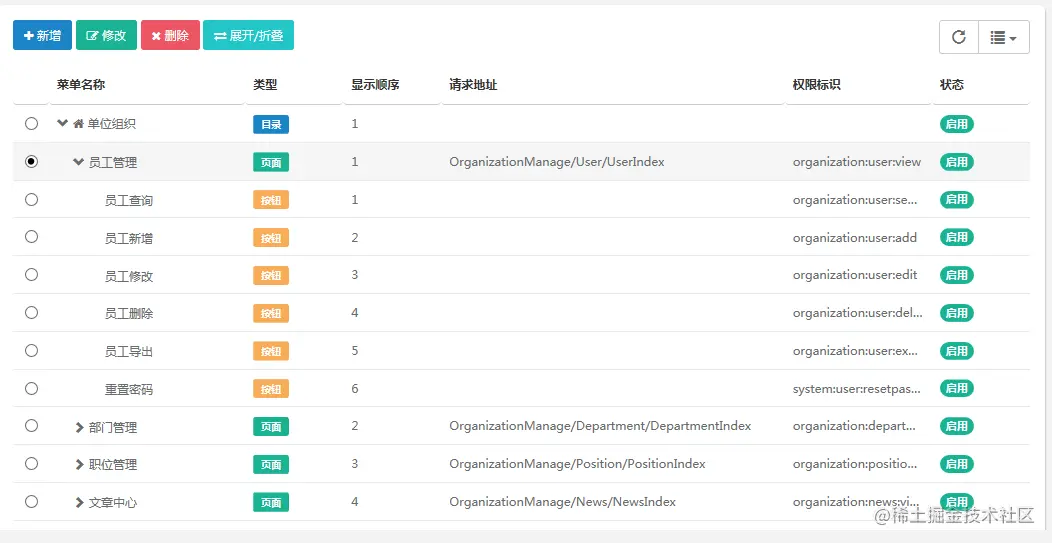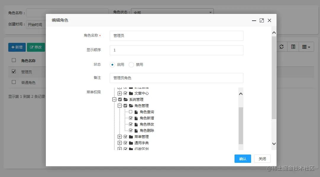 - 角色管理:角色菜单权限分配,角色对应权限,员工属于某个角色
