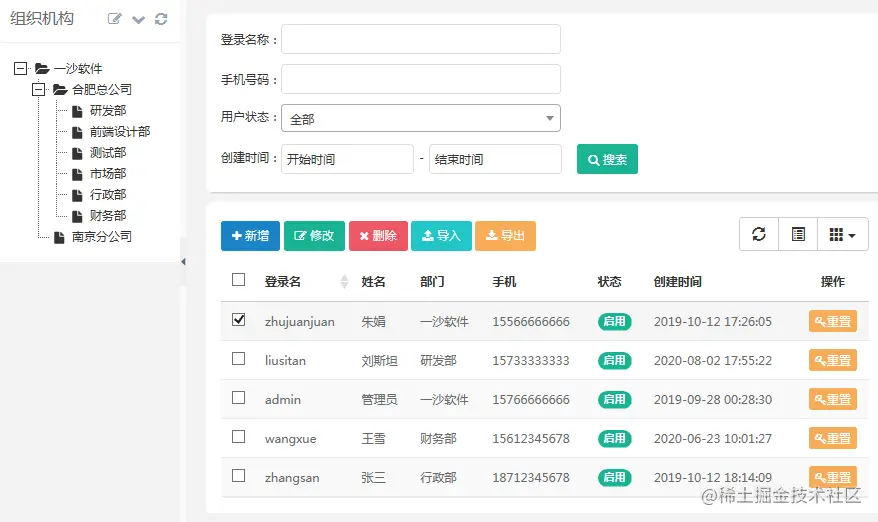 - 部门管理:配置系统组织机构(公司、部门、小组)