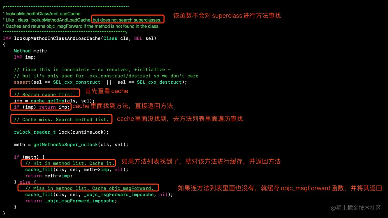 cls的方法列表进行二分/遍历查找,如果找到了对应函数,首先会将该方法缓存到obj的类对象cls的cache_t里面,然后对函数进行调用。- (4) 在每次进行缓存操作之前,首先需要检查缓存容量,如果缓存内的方法数量超过规定的临界值(