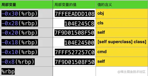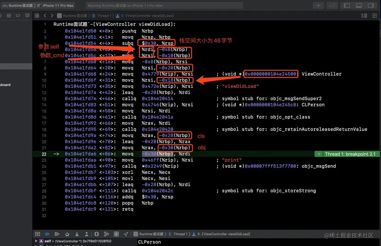 此时, viewDidLoad函数栈上所有的局部变量已经赋值完毕,汇编情况如下