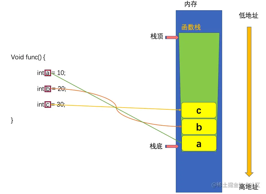 栈空间的作用,是用来存放被调用函数其内部所定义的局部变量的。对于arm64架构来说,这么理解就够了,如果你恰好了解过8086汇编,那么可能知道,栈空间里面还会存放函数的参数,但是对于arm64来说,函数的参数通常会放到寄存器里面,所以我们就先简单的认为,函数的栈空间里面放的就是函数的局部变量。而且局部变量的存放顺序,是根据定义的先后顺序,从函数栈底开始,一个一个排列,最先定义的局部变量位于栈底(高地址),通过下图来描绘一下
