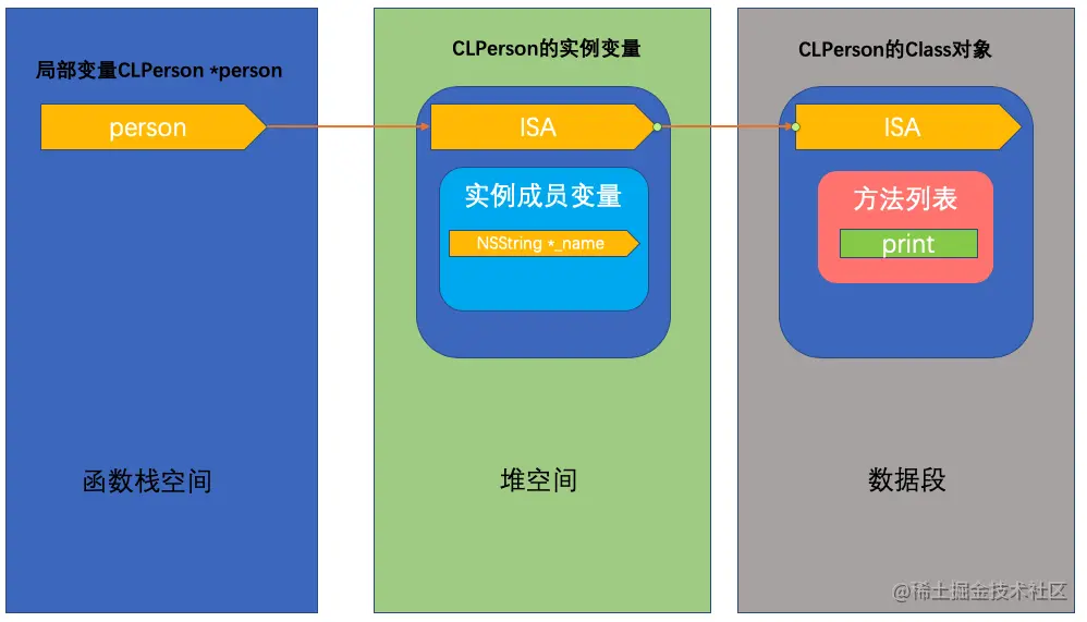 回想一下消息发送的本质,[person print]是从person所指向的结构体(实例对象)取出第一个成员变量isa,然后根据isa找到对应Class对象的内存空间,最后在Class对象的方法列表里面进行方法查找,最后调用方法。