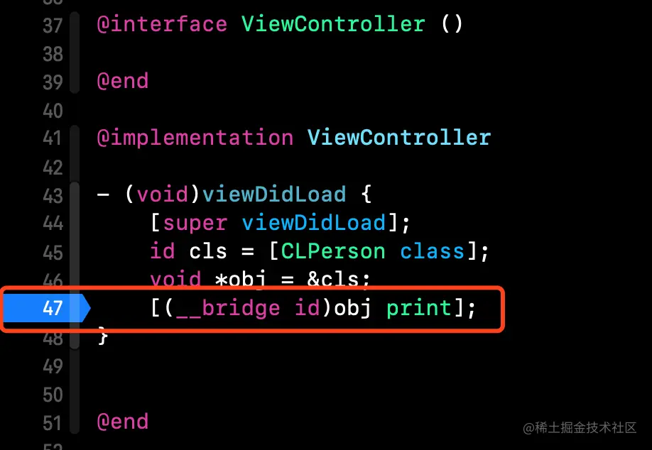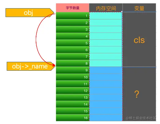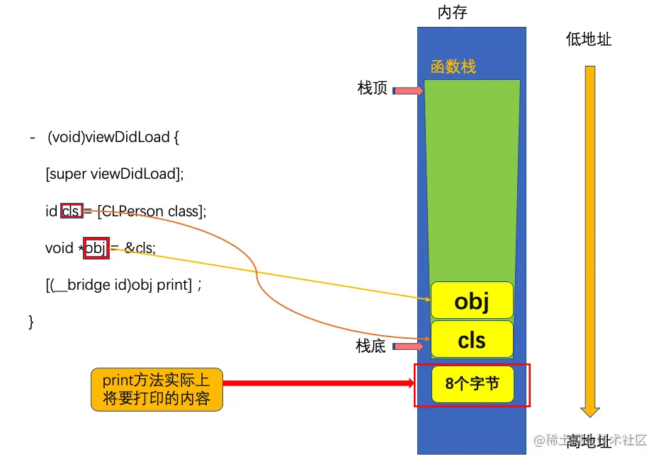 两张图本质是一样的,只不过在面试题的场景里,print方法被调用的时候,其内部的self = obj,因此self.name作用就是从obj所指向的内存空间,往高地址偏移8个字节,而obj指向了cls的内存地址,cls也是是一个指针,所以占8个字节,因此self.name取到的实际上恰好是指针变量cls之后接下来的一段8字节内存空间,所以最终print打印出的就是这段内存里面存储的内容。而结果我们已经看到了,打印的是<ViewController: 0x7fce43e08aa0>,接下来我们就要分析一下为啥cls下面存着的是ViewController对象。