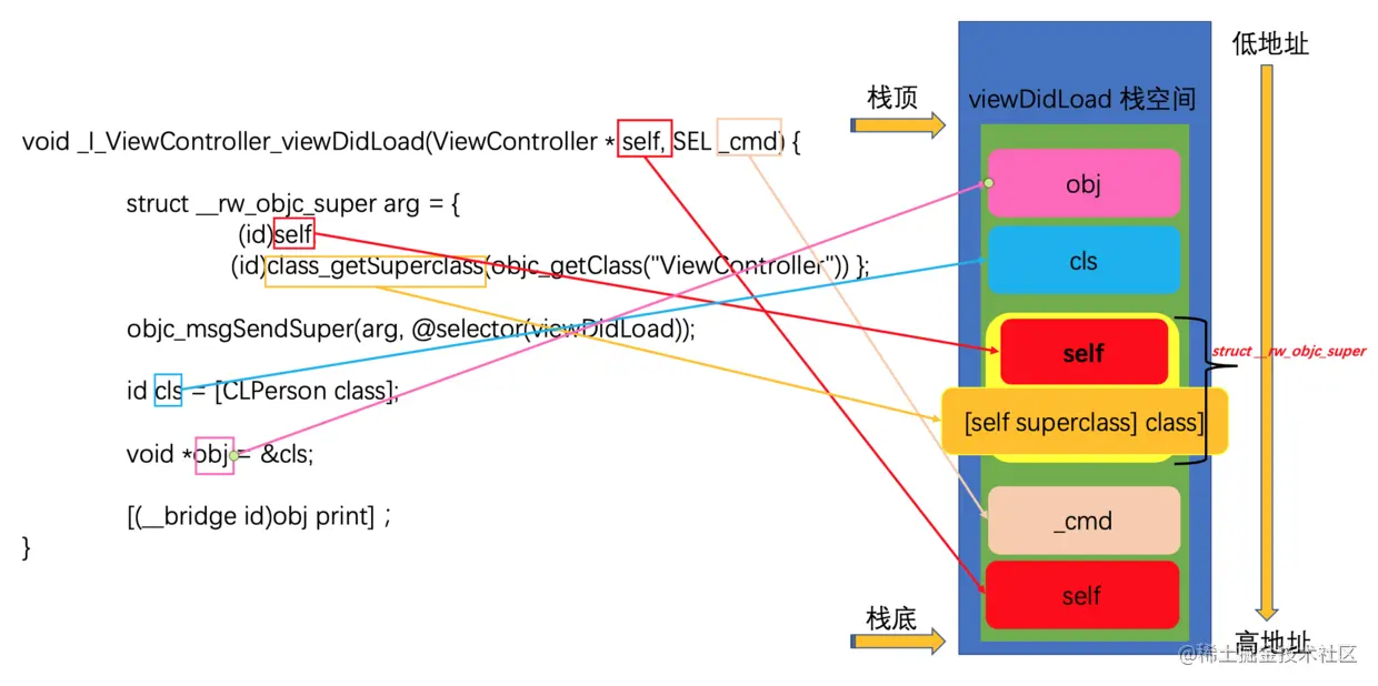 注意这个函数的第一个参数是一个结构体__rw_objc_super,那么这个结构体参数实际上是在当前viewDidLoad函数的作用域里面被定义赋值,然后再传入objc_msgSendSuper作为参数的。说白了viewDidLoad还含有一个隐藏局部变量,其内部实际上等同于这么写