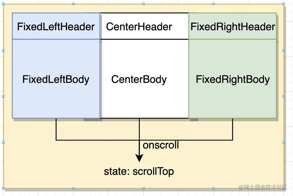 在方案3中,由于使用了div的flex排版而不是原生table,为了实现列固定时,我们需要使用三个table来做固定效果,因此滚动时,我们需要同时改变多个表格的scrollTop以及其数据截取。