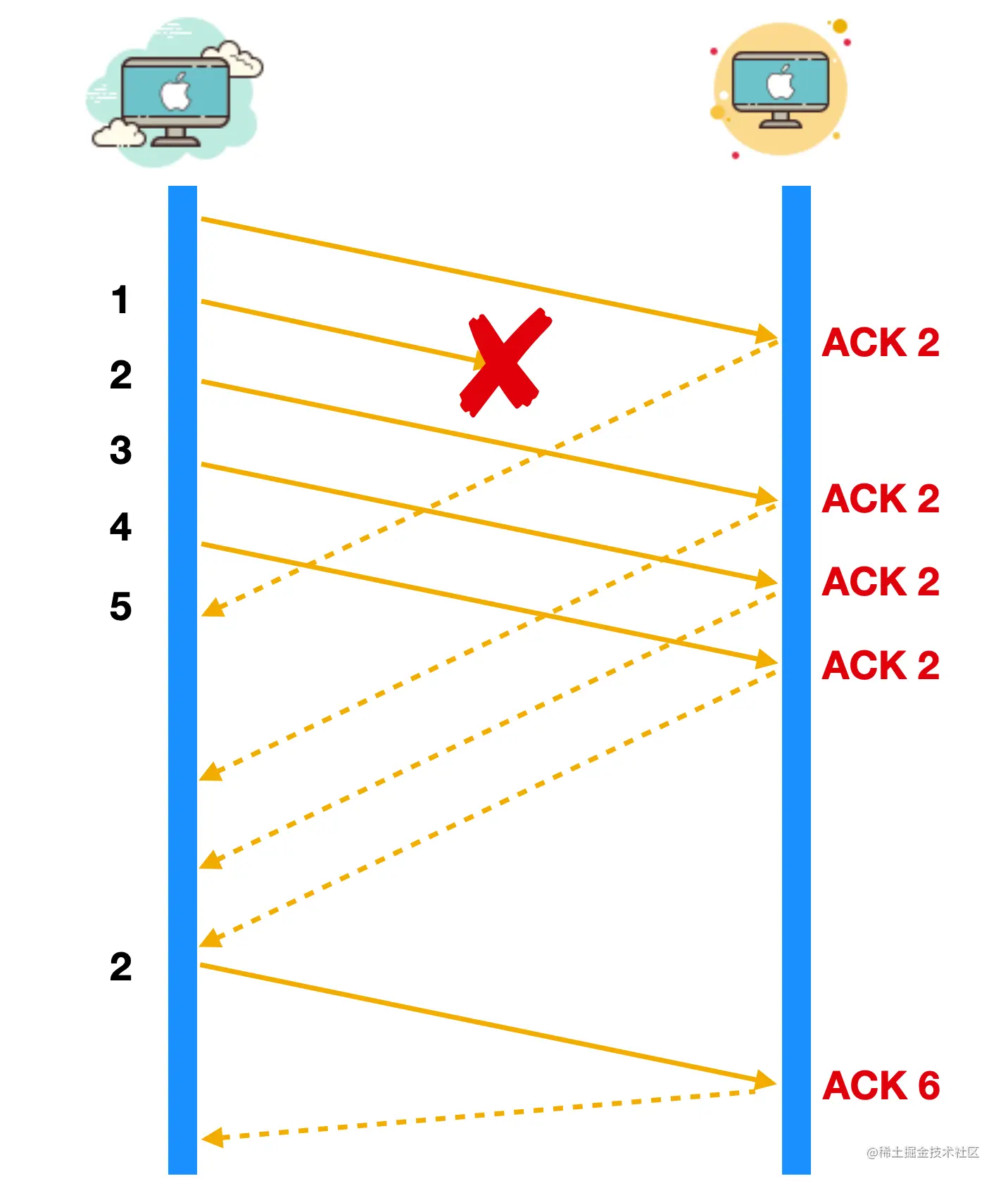 如上图所示,报文段 1 成功接收并被确认为 ACK 2,接收端的期待序号为 2,当报文段 2 丢失后,报文段 3。失序到达,但是与接收端的期望不匹配,所以接收端会重复发送冗余 ACK 2。