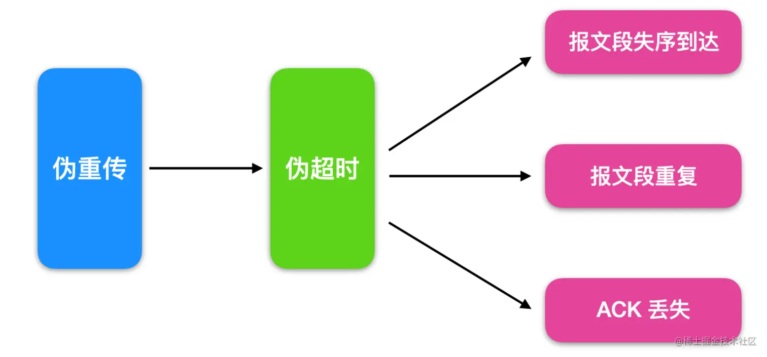 在某些情况下,即使没有出现报文段的丢失也可能会引发报文重传。这种重传行为被称为 伪重传(spurious retransmission) ,这种重传是没有必要的,造成这种情况的因素可能是由于伪超时(spurious timeout),伪超时的意思就是过早的判定超时发生。造成伪超时的因素有很多,比如报文段失序到达,报文段重复,ACK 丢失等情况。