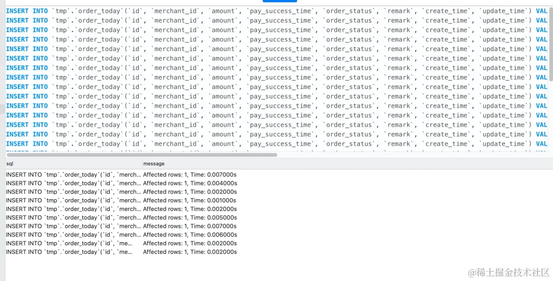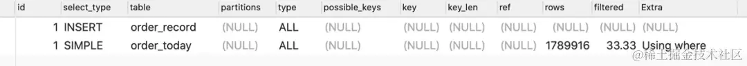 通过观察迁移sql的执行情况你会发现order_today是全表扫描,也就意味着在执行insert into select from 语句时,mysql会从上到下扫描order_today内的记录并且加锁,这样一来不就和直接锁表是一样了。
